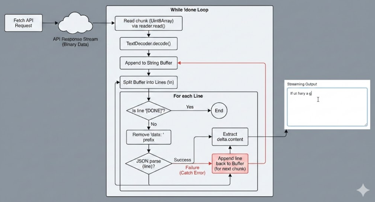TextDecoder是连接网络二进制流和 JS 字符串的桥梁。 - 鲁棒性解析: 网络传输的不确定性要求我们在前端必须实现"拼接-尝试解析-回退缓存"的机制,以防止 JSON 解析错误导致程序崩溃。