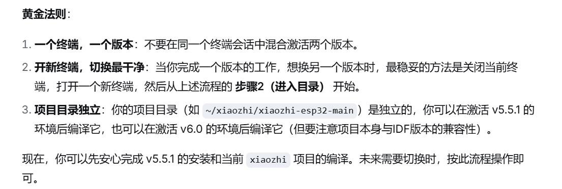 如果要使用其他版本(例如你原来的 esp-idf-backup),只需关闭当前终端,打开新终端,然后去那个版本的目录执行其 export.sh 即可。
