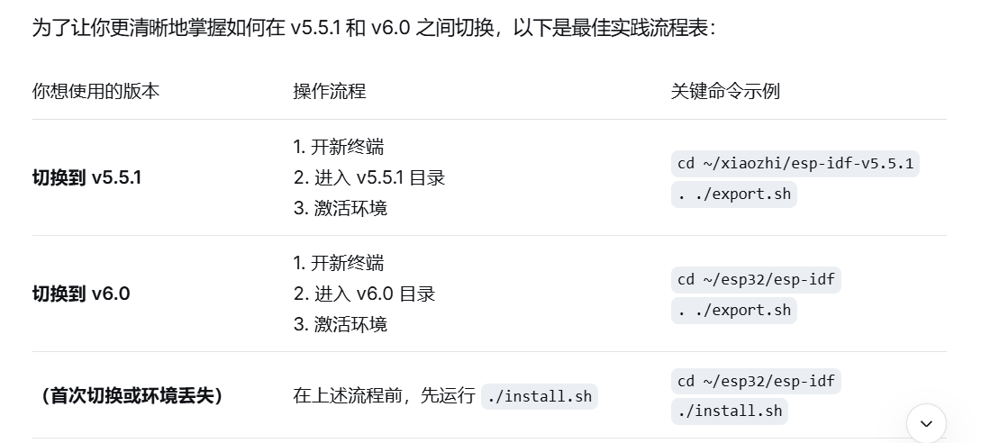 后续 :当某天你需要用回 ~/esp32/esp-idf (v6.0)时,只需进入其目录,运行 ./install.sh 它会自动重建v6.0的Python环境。