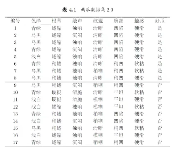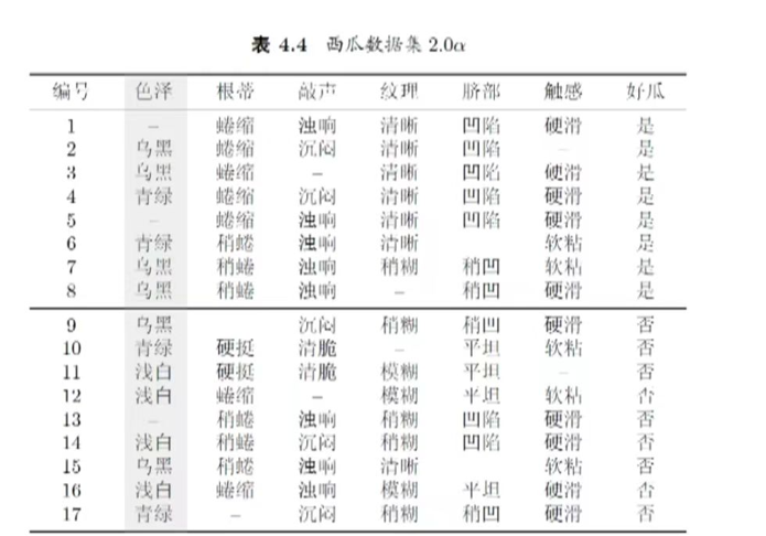 已知数据集 ( D ) 包含17个样本,正例(好瓜=是)有8个,反例(好瓜=否)有9个。