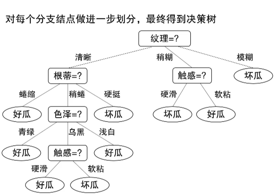 综上,通过计算各属性的信息增益,选择"纹理"作为最优划分属性,后续可继续对其子集递归划分。