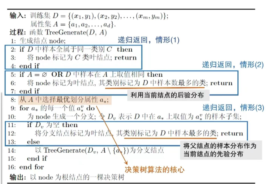 - 步骤 11-14 为递归返回情形 (3) :若某分支无样本,标记为叶结点(类别取父结点样本最多的类)。