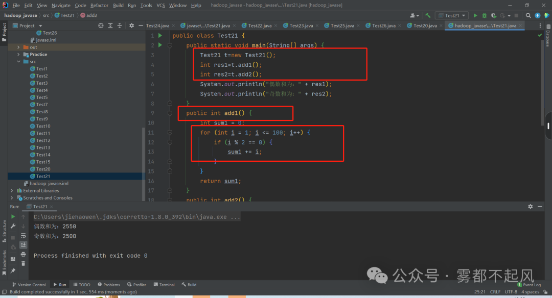 练习:取1-100偶数和 取1-100奇数和 (普通方法实现 返回累加和值 不要参数(for循环实现))用到for循环 方法调用 if 变量在哪儿声明 在哪儿用public class Test21 { public static void main(String[] args) { Test21 t=new Test21(); int res1=t.add1(); int res2=t.add2(); System.out.println("偶数和为:" + res1); System.out.println("奇数和为:" + res2); } public int add1() { int sum1 = 0; for (int i = 1; i <= 100; i++) { if (i % 2 == 0) { sum1 += i; } } return sum1; } public int add2() { int sum2 = 0; for (int i = 1; i <= 100; i++) { if (i % 2 == 1) { sum2 += i; } } return sum2; }}