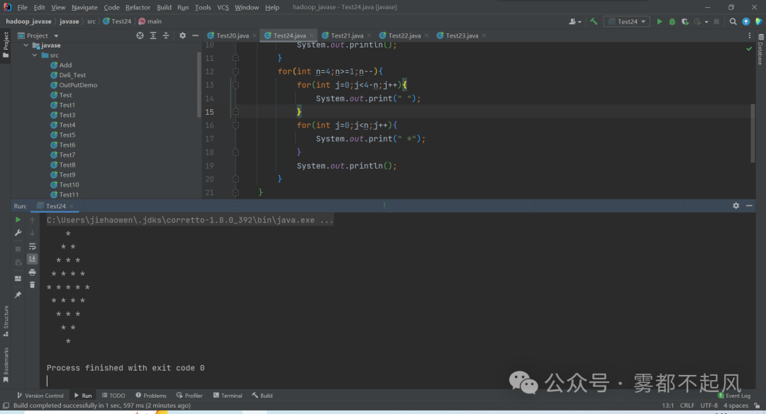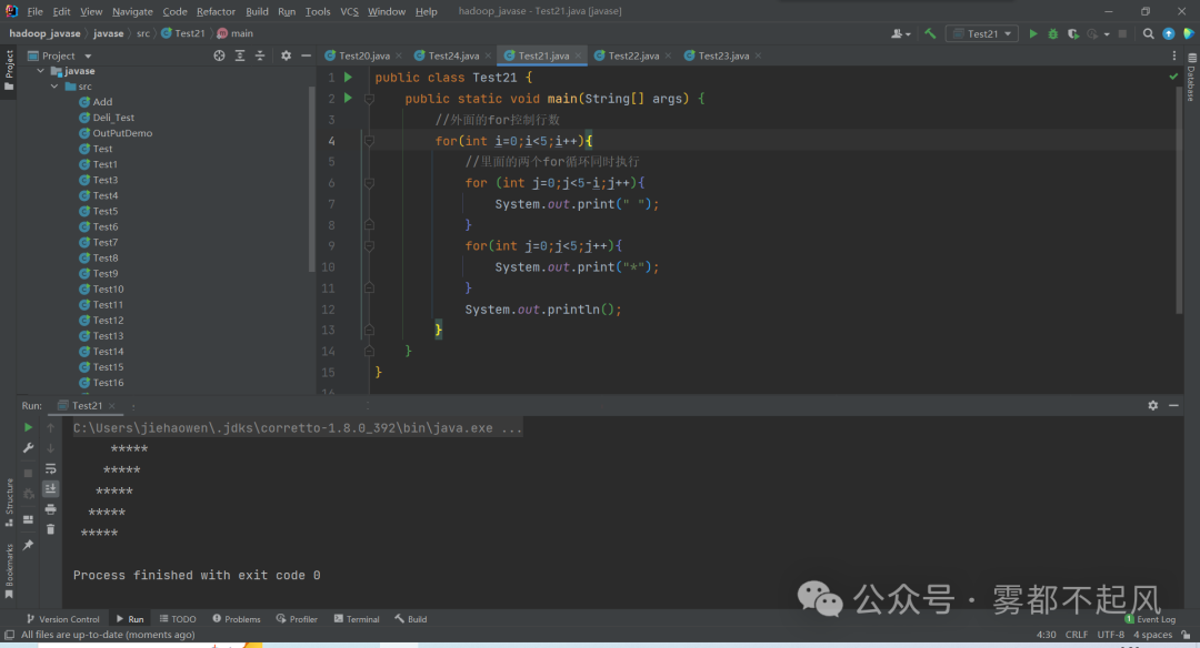 2.菱形public class Test21 { public static void main(String[] args) { //外面的for控制行数 for(int i=0;i<5;i++){ //里面的两个for循环同时执行 for (int j=0;j<5-i;j++){ System.out.print(" "); } for(int j=0;j<5;j++){ System.out.print("*"); } System.out.println(); } }}