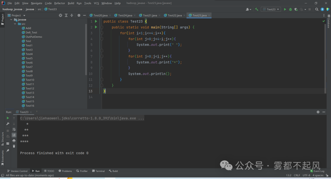 4.public class Test23 { public static void main(String[] args) { for(int i=1;i<=4;i++){ for(int j=0;j<4-i;j++){ System.out.print(" "); } for(int j=0;j<i;j++){ System.out.print("*"); } System.out.println(); } }}