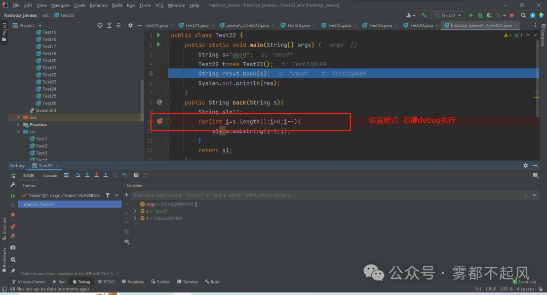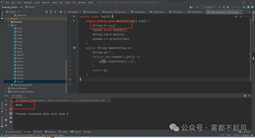 练习:将主方法的一个字符串传递到普通方法中 用for循环作倒序 把倒序后的值 返回到主方法并打印用到 方法调用 传递参数 返回值 substring return for public class Test22 {//还有另一种方法 将循环的值放在+后面 就可以倒序了 public static void main(String[] args) { String s="abcd"; Test22 t=new Test22(); String res=t.back(s); System.out.println(res); } public String back(String s){ String s1=""; for(int i=s.length();i>0;i--){ s1+=s.substring(i-1,i); } return s1; }}