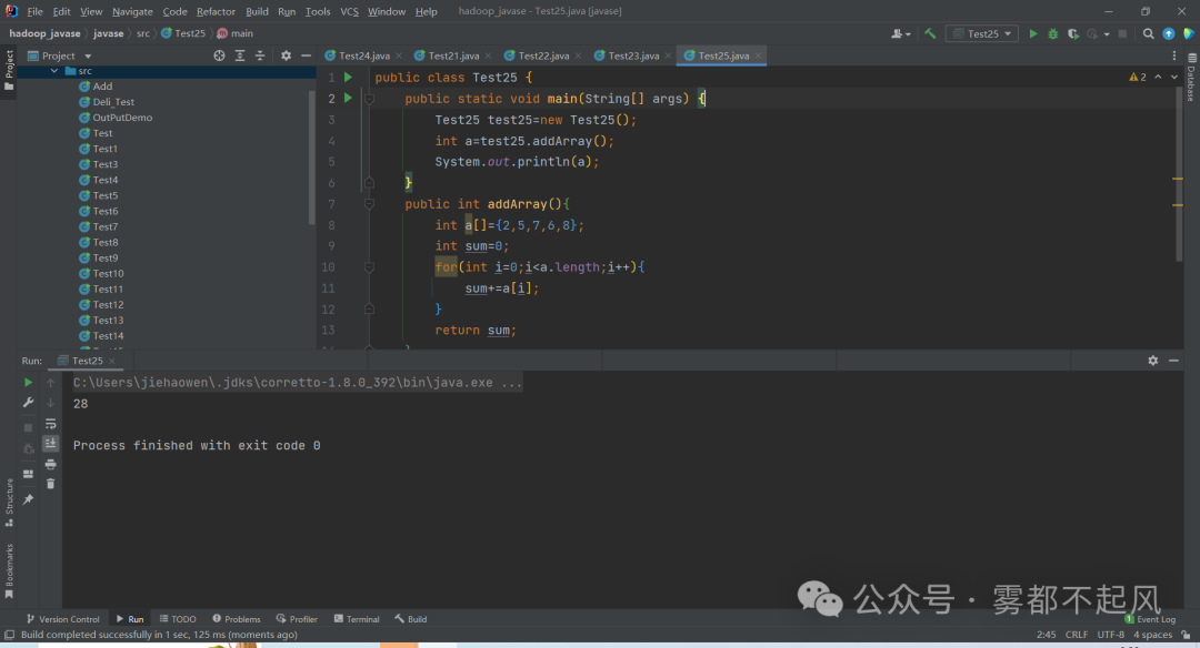 练习:在普通方法当中 定义一个整型数组 并计算累加和 并把和值返回到主方法public class Test25 { public static void main(String[] args) { Test25 test25=new Test25(); int a=test25.addArray(); System.out.println(a); } public int addArray(){ int a[]={2,5,7,6,8}; int sum=0; for(int i=0;i<a.length;i++){ sum+=a[i]; } return sum; }}