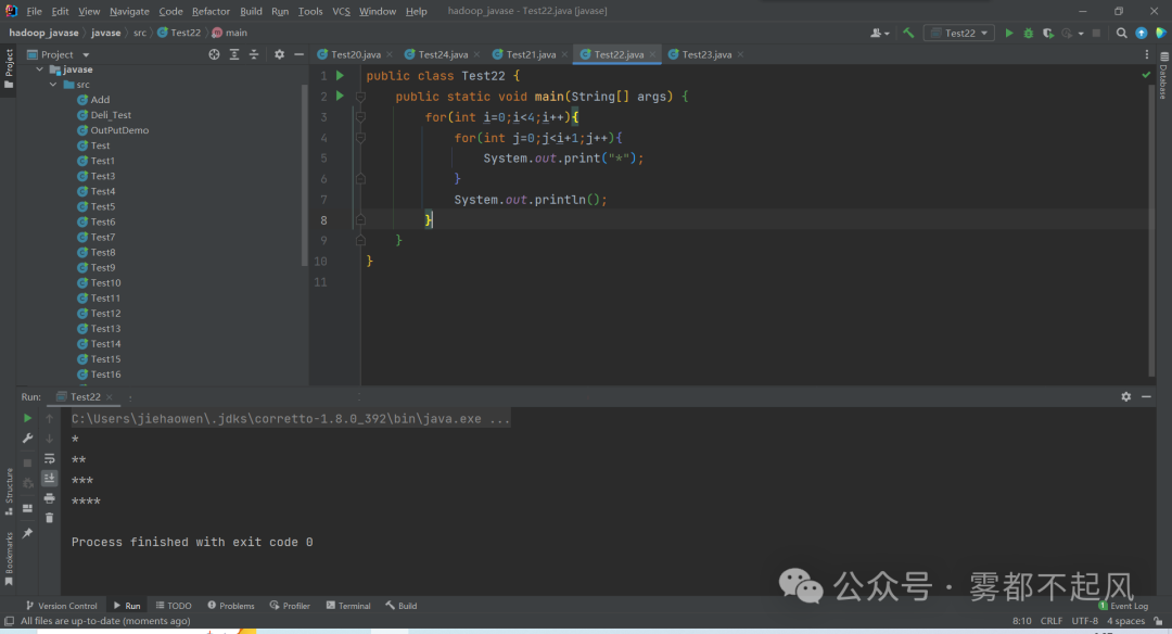 3.public class Test22 { public static void main(String[] args) { for(int i=0;i<4;i++){ for(int j=0;j<i+1;j++){ System.out.print("*"); } System.out.println(); } }}
