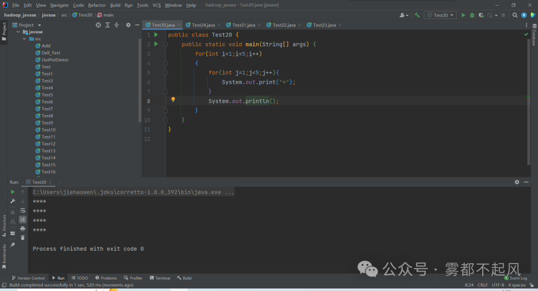 1.矩形public class Test20 { public static void main(String[] args) { for(int i=1;i<5;i++) { for(int j=1;j<5;j++){ System.out.print("*"); } System.out.println(); } }}