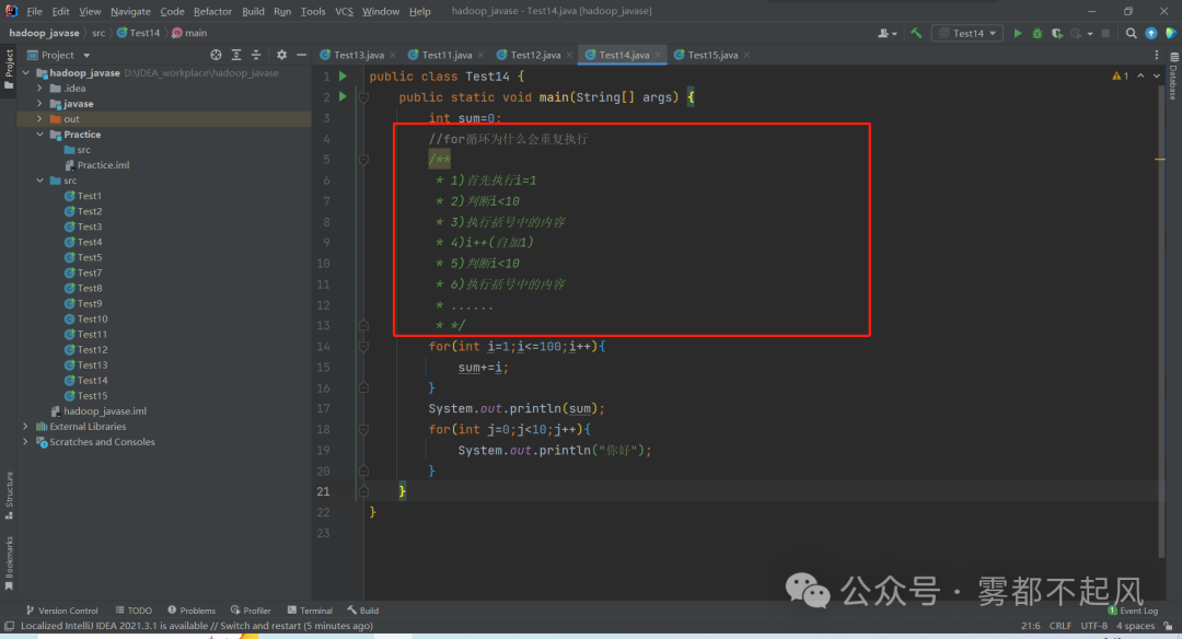 1.for循环计算1-100的和2.打印十次你好public class Test14 { public static void main(String[] args) { int sum=0; //for循环为什么会重复执行 /** * 1)首先执行i=1 * 2)判断i<10 * 3)执行括号中的内容 * 4)i++(自加1) * 5)判断i<10 * 6)执行括号中的内容 * ...... * */ for(int i=1;i<=100;i++){ sum+=i; } System.out.println(sum); for(int j=0;j<10;j++){ System.out.println("你好"); } }}