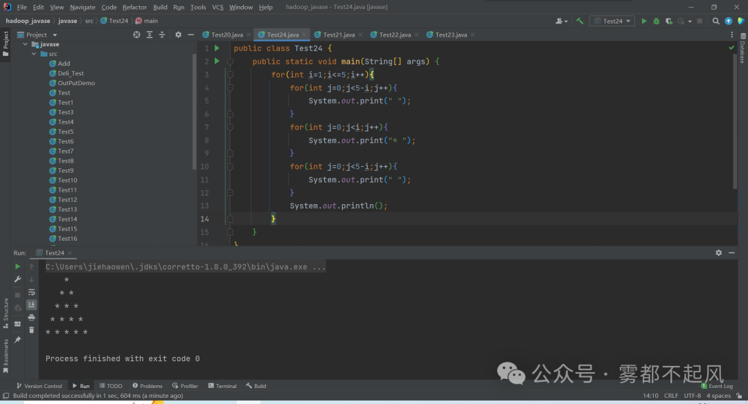 5.在4的基础上打印*时加一个空格 "* "public class Test24 { public static void main(String[] args) { for(int i=1;i<=5;i++){ for(int j=0;j<5-i;j++){ System.out.print(" "); } for(int j=0;j<i;j++){ System.out.print("* "); } for(int j=0;j<5-i;j++){ System.out.print(" "); } System.out.println(); } }}