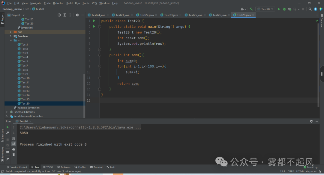 练习:取1-100和 (普通方法实现 返回累加和值 不要参数(for循环实现))用到for循环 方法调用 变量在哪儿声明 在哪儿用public class Test20 { public static void main(String[] args) { Test20 t=new Test20(); int res=t.add(); System.out.println(res); } public int add(){ int sum=0; for(int i=1;i<=100;i++){ sum+=i; } return sum; }}