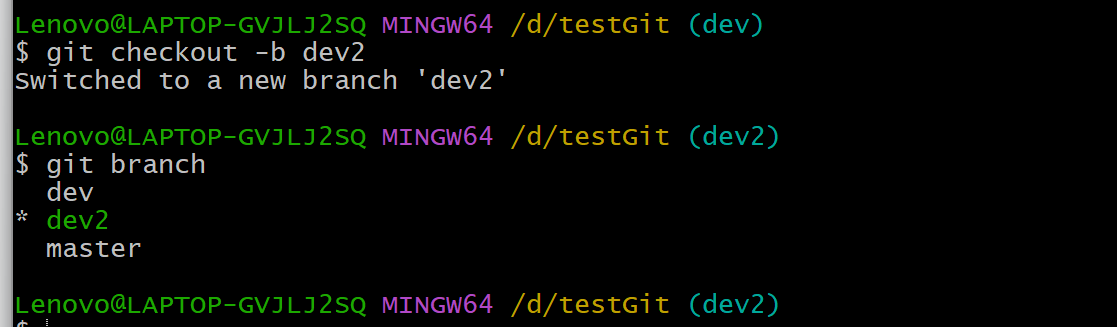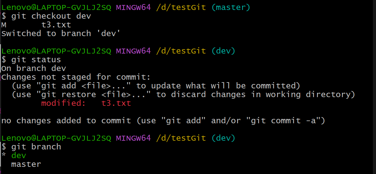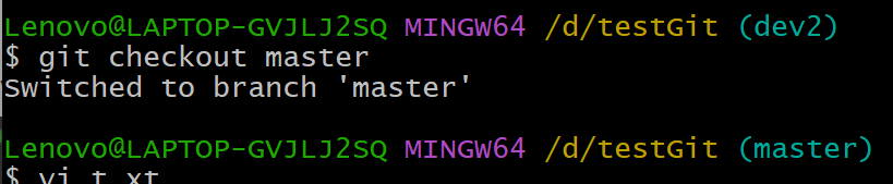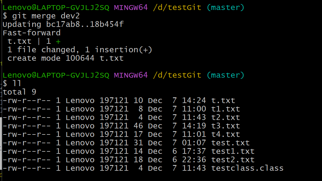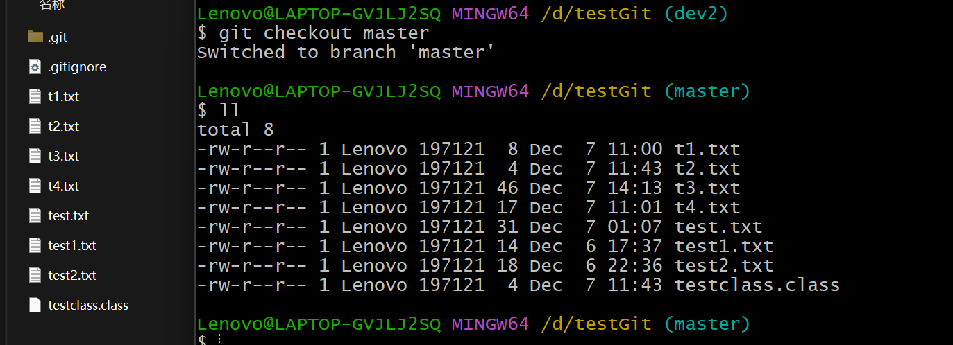 在dev2分支创建一个文件t.txt并且提交到版本库,发现在dev2分支可以看到这个文件,当切换会master时候无法看到这个文件