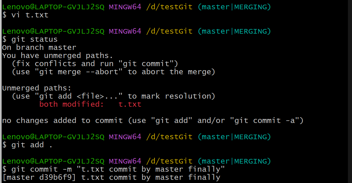 在master分支里面修改t.txt文件同时添加一行update by master后提交