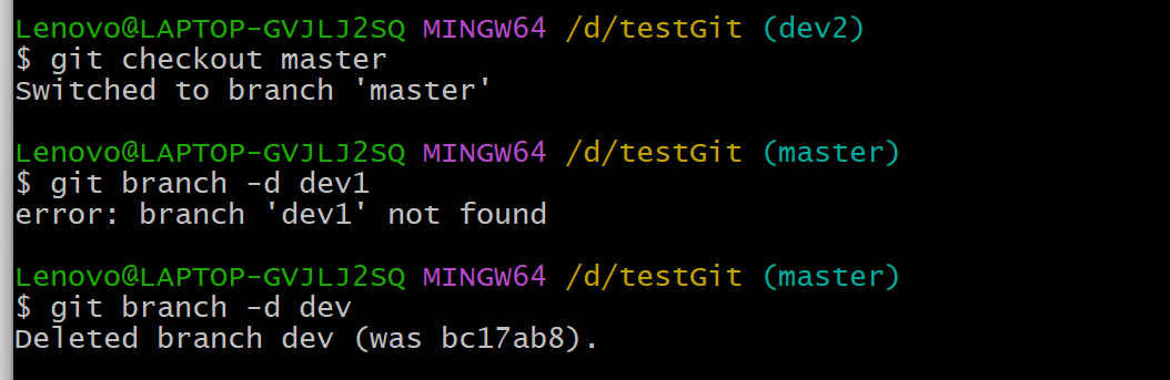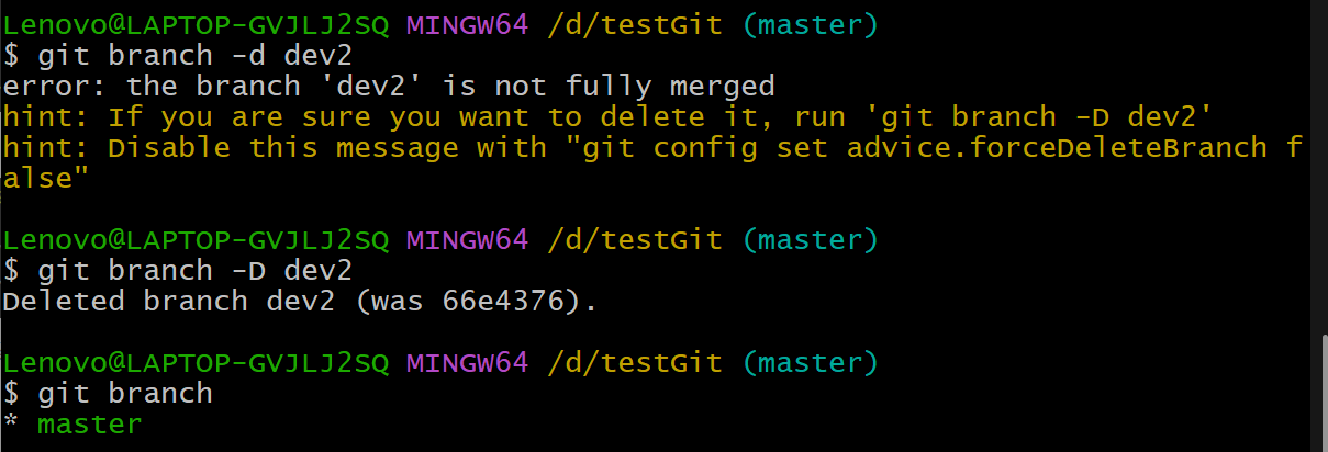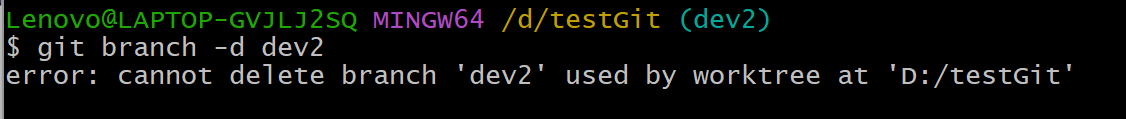 发现dev2发生了变化,同时没有合并不能删除。如果要强制删除可以