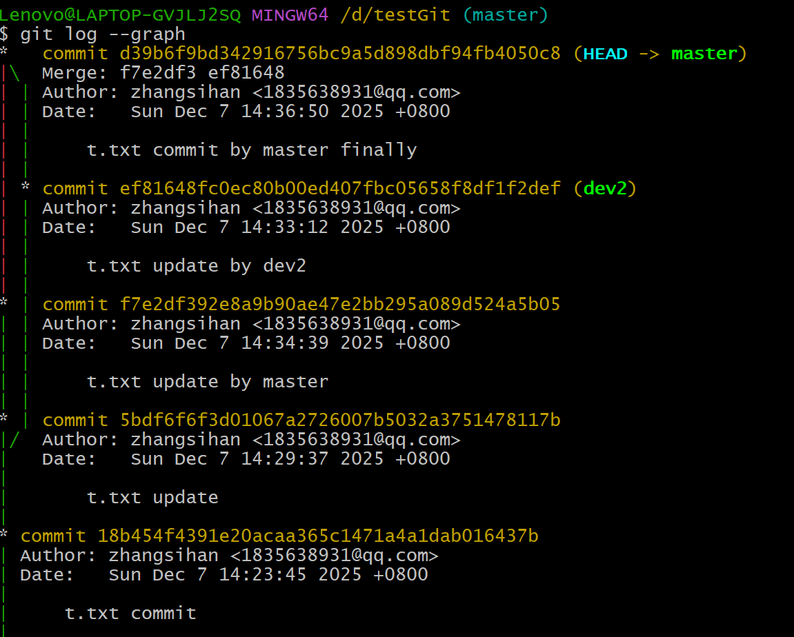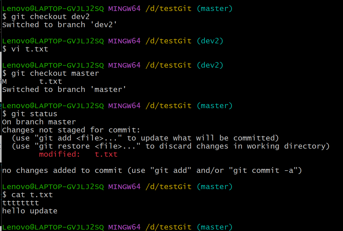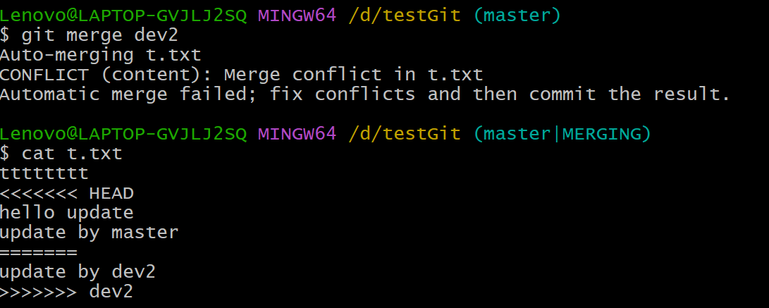 如果修改的是同一个文件也可以做同样的合并,让我们切换到dev2分支修改t.txt中的内容。在t.txt中添加了一行内容