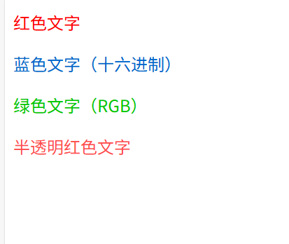 html<!-- 使用style属性设置颜色 --> <p style="color: red;">红色文字</p> <p style="color: #0066cc;">蓝色文字(十六进制)</p> <p style="color: rgb(0, 200, 0);">绿色文字(RGB)</p> <p style="color: rgba(255, 0, 0, 0.7);">半透明红色文字</p>
