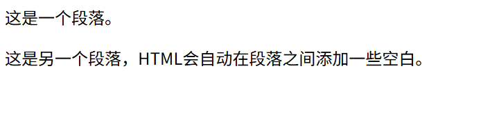 html<p>这是一个段落。</p> <p>这是另一个段落,HTML会自动在段落之间添加一些空白。</p>