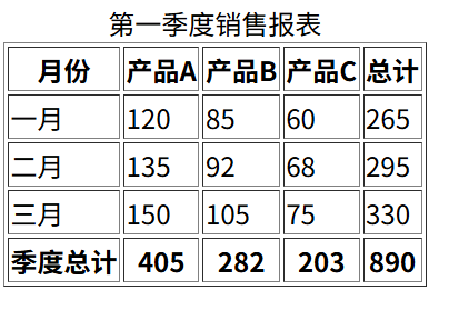 html<!-- 带标题的表格 --> <table > <caption>第一季度销售报表</caption> <thead> <tr> <th>月份</th> <th>产品A</th> <th>产品B</th> <th>产品C</th> <th>总计</th> </tr> </thead> <tbody> <tr> <td>一月</td> <td>120</td> <td>85</td> <td>60</td> <td>265</td> </tr> <tr> <td>二月</td> <td>135</td> <td>92</td> <td>68</td> <td>295</td> </tr> <tr> <td>三月</td> <td>150</td> <td>105</td> <td>75</td> <td>330</td> </tr> </tbody> <tfoot> <tr> <th>季度总计</th> <th>405</th> <th>282</th> <th>203</th> <th>890</th> </tr> </tfoot> </table>