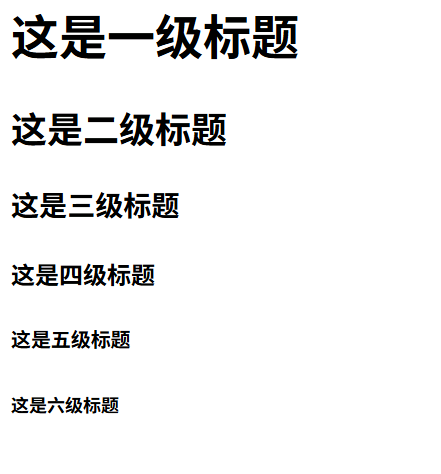 html<h1>这是一级标题</h1> <h2>这是二级标题</h2> <h3>这是三级标题</h3> <h4>这是四级标题</h4> <h5>这是五级标题</h5> <h6>这是六级标题</h6>