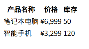 html<table > <thead> <tr> <th>产品名称</th> <th>价格</th> <th>库存</th> </tr> </thead> <tbody> <tr> <td>笔记本电脑</td> <td>¥6,999</td> <td>50</td> </tr> <tr> <td>智能手机</td> <td>¥3,299</td> <td>120</td> </tr> </tbody> </table>