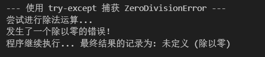 print("--- 使用 try-except 捕获 ZeroDivisionError ---")