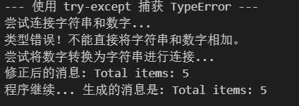 safe_divide("10", 2) # TypeError (如果我们不先做类型转换的话)