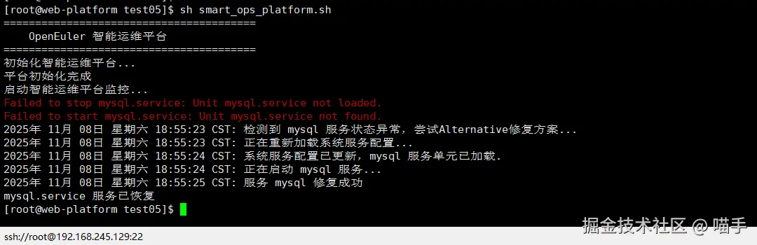 深夜的告警铃声总是格外刺耳。记得那个雨夜,核心服务因内存泄漏而崩溃,我们花了三个小时才恢复业务。那一刻我意识到,被动响应式的运维已经走到了尽头。真正的现代化运维,应该是系统能够自我感知、自我诊断,甚至在问题发生前就自动修复。 今天,我要在openEuler上构建一个智能运维平台,让系统拥有"自愈"能力。这不仅是技术实践,更是运维理念的革新------从"救火队员"到"系统医生"的转变。