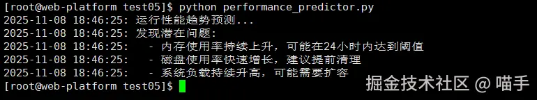 这个智能运维平台实现了真正的"自愈"能力。health_check函数定期检查所有关键服务的状态,auto_heal_service在发现服务异常时自动尝试修复。auto_clean_disk和auto_clean_memory实现了资源自动管理,防止系统因资源耗尽而崩溃。整个平台通过monitor_platform函数协调各个组件,形成了完整的运维闭环。