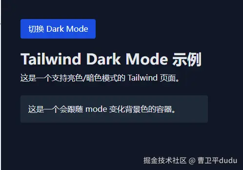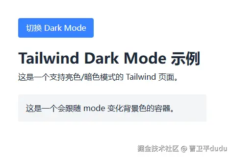 <h1 class="mt-6 text-3xl font-bold">Tailwind Dark Mode 示例</h1>