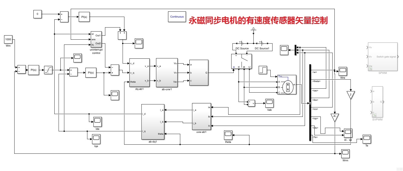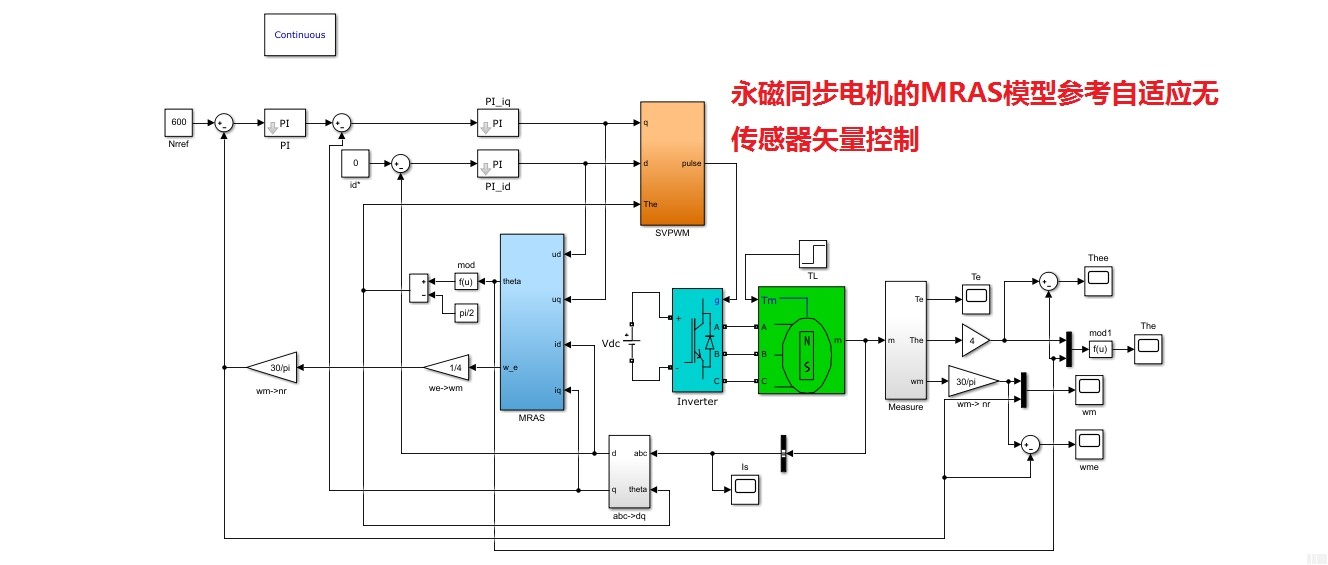 今天咱们来扒一扒永磁同步电机那些有意思的控制算法仿真,特别是Simulink模型里藏着的小秘密。搞过电机控制的都知道,无传感器算法就像玩密室逃脱------总得找点线索才能定位转子位置。先说说MRAS这个老江湖,它的自适应机制贼有意思。