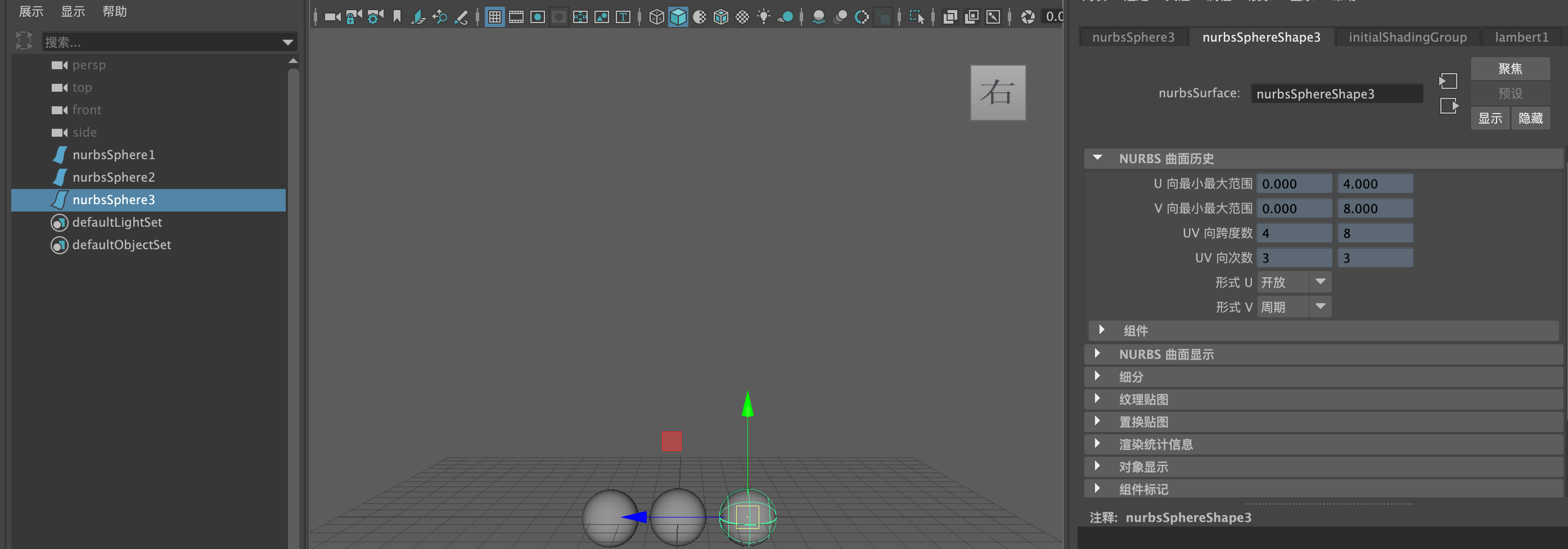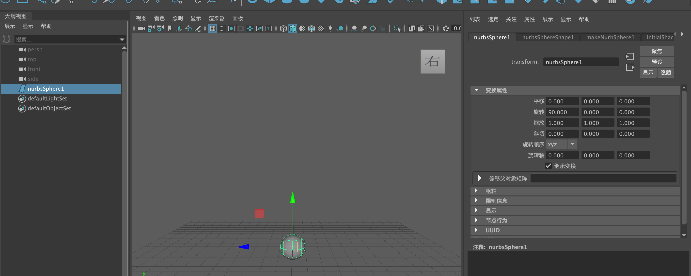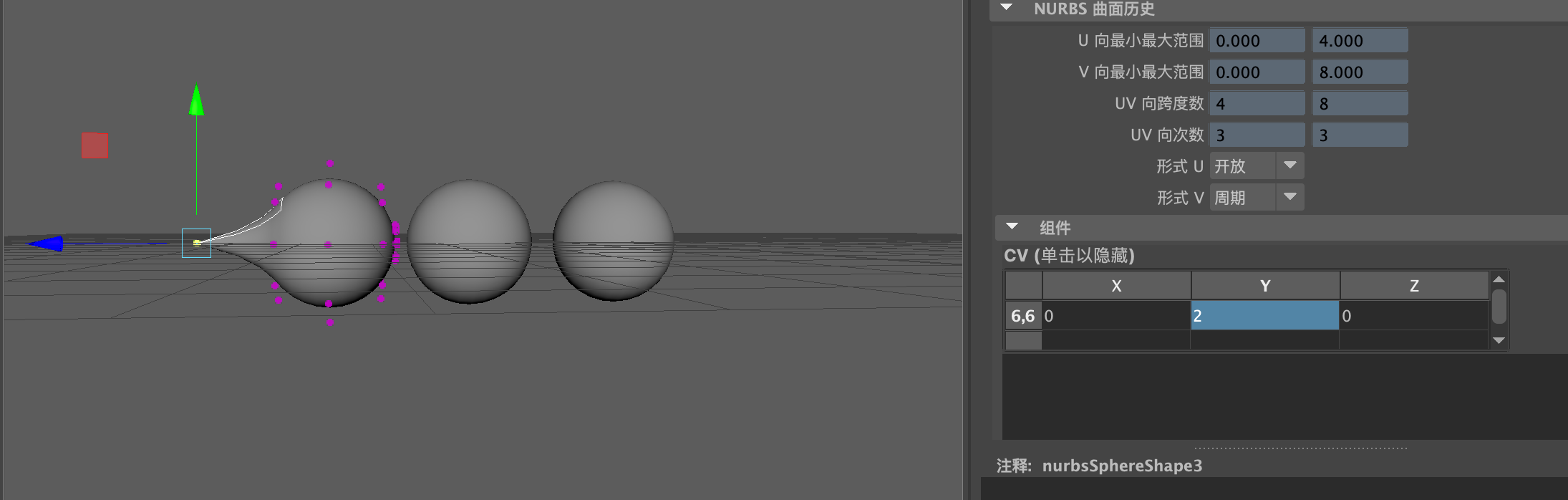 (1)启动中文版Maya 2024软件,单击"曲面"工具架上的"NURBS球体"图标(2)在场景中创建一个球体模型