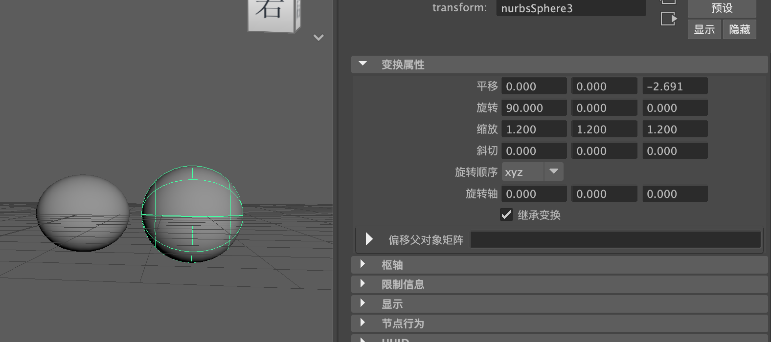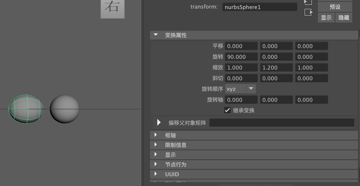 (3)在"通道盒/层编辑器"面板中,设置球体模型的"平移X""平移Y"和"平移Z"均为0,设置"旋转X"为90