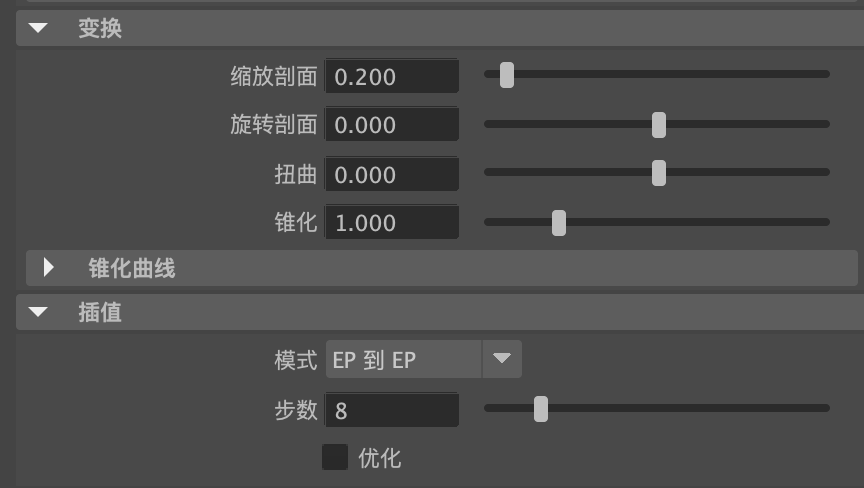 (16)在"变换"卷展栏中,设置"缩放剖面"为0.2