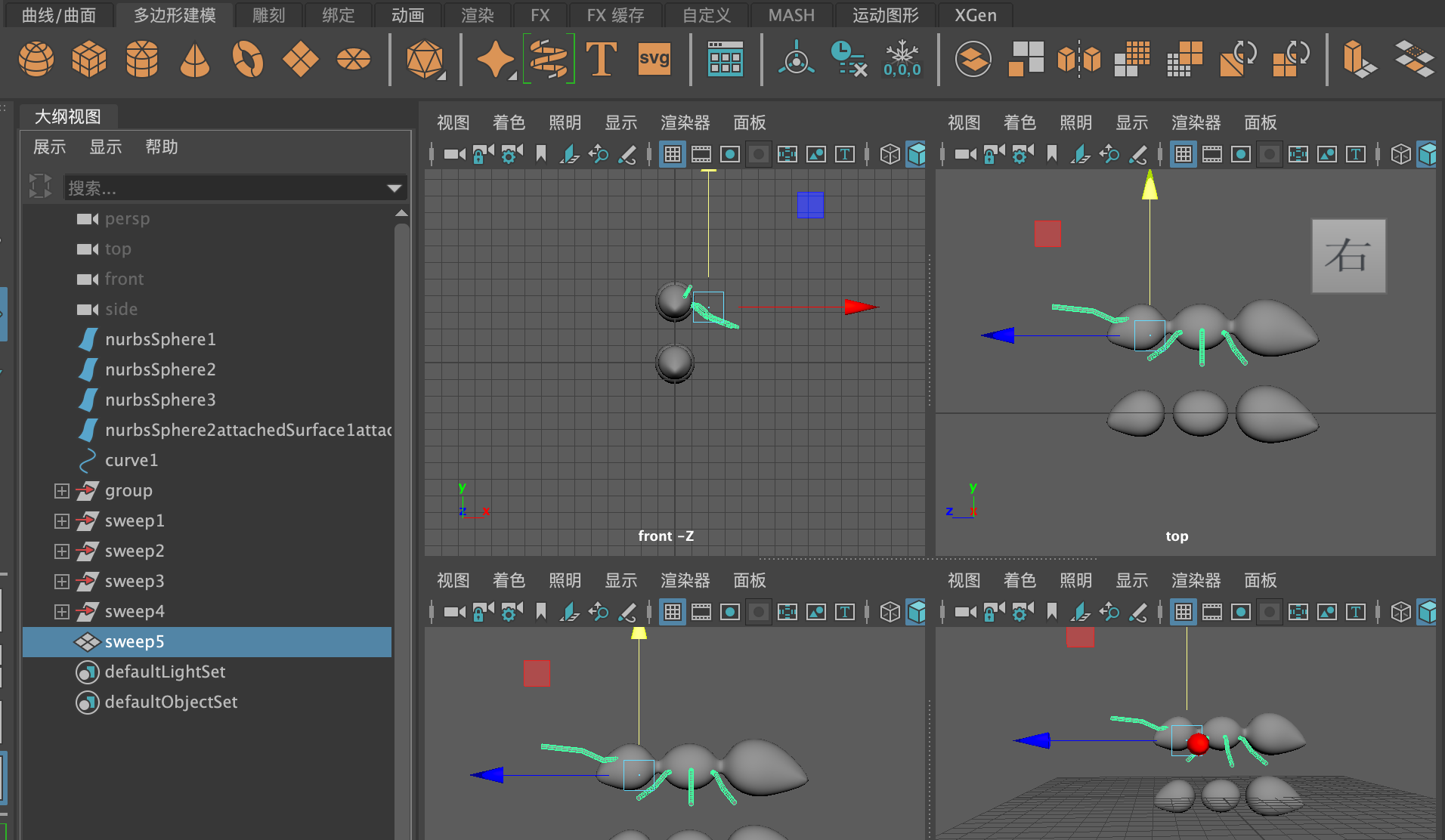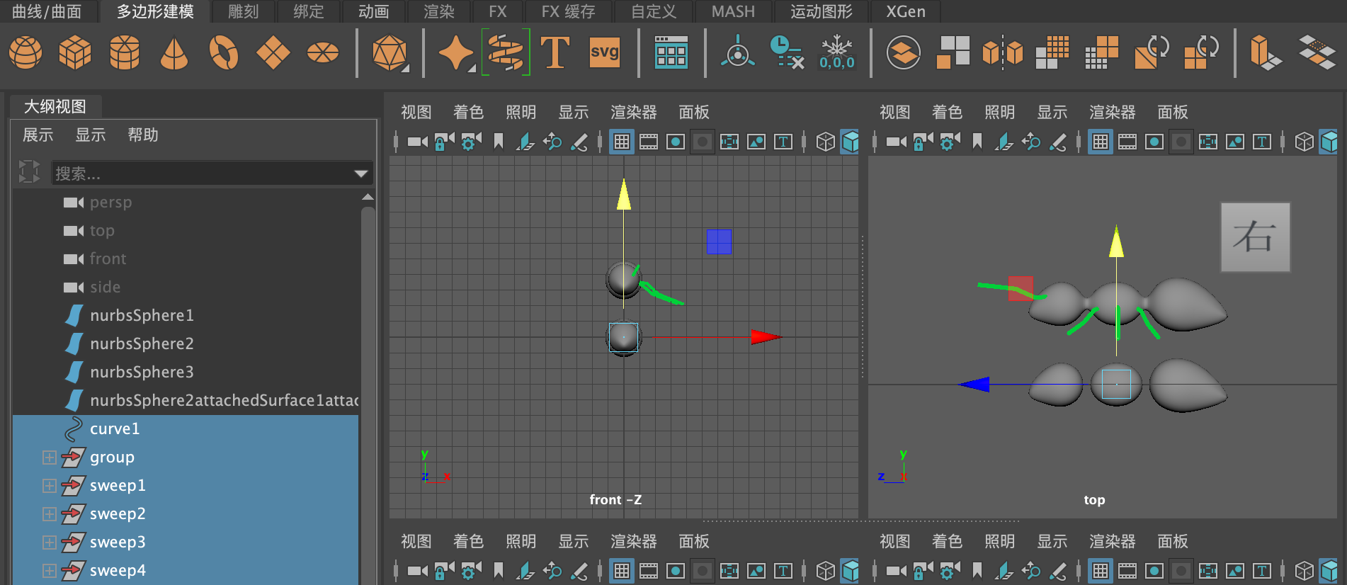 (14)选择这些线条,单击"多边形建模"工具架上的"扫描网格"图标