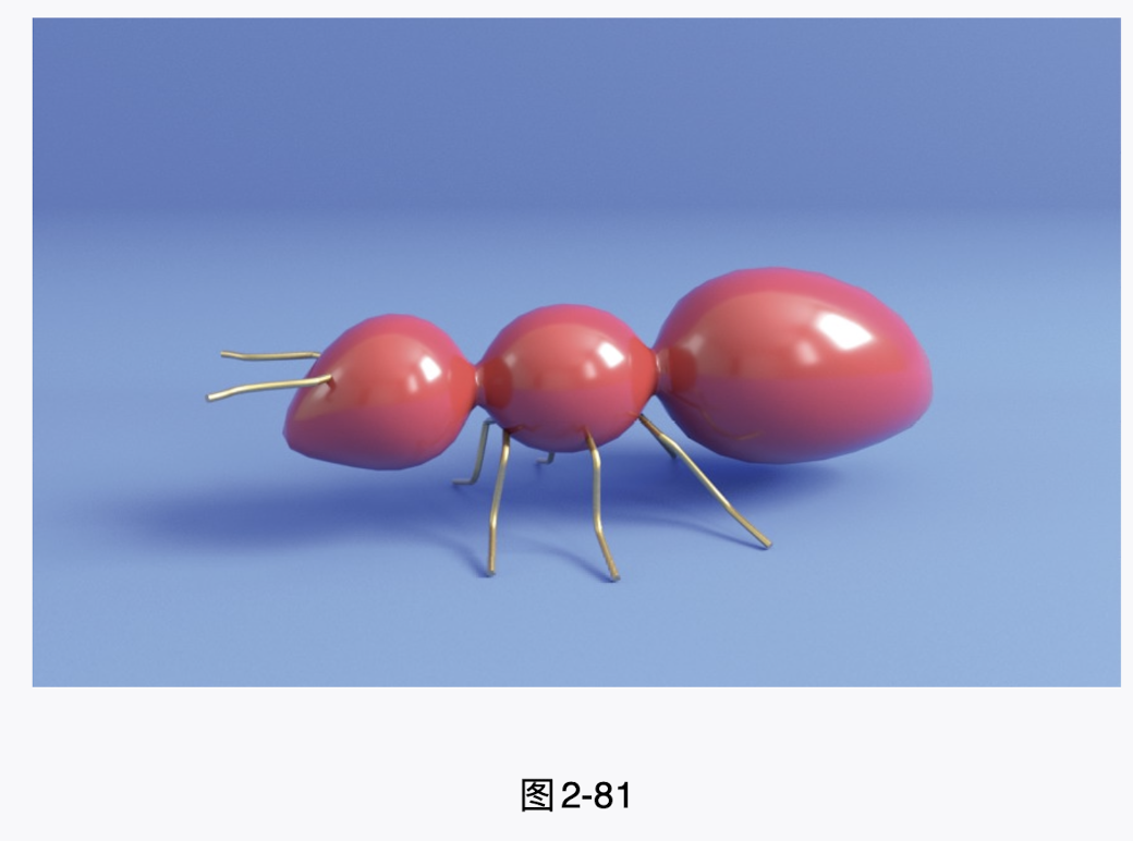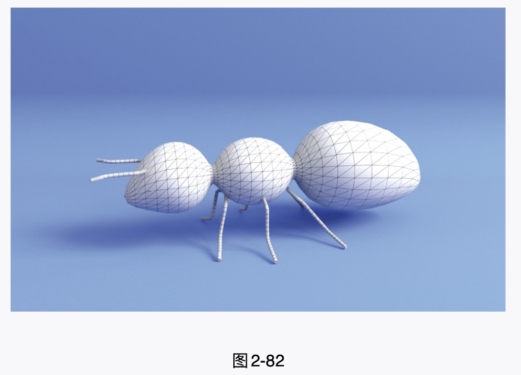 本实例将使用"NURBS球体"和"EP曲线工具"制作一个玩具蚂蚁模型,模型的最终渲染效果如图2-81所示,线框渲染效果如图2-82所示。