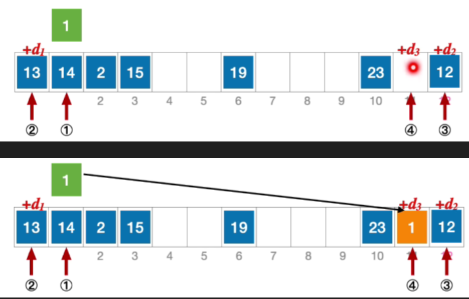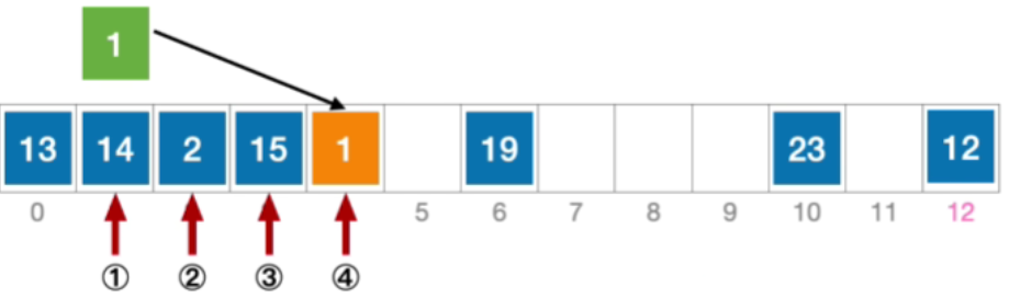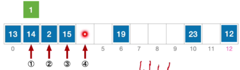 - 接下来应该探测往右偏移3的位置,也就是4,发现是空,因此插入1