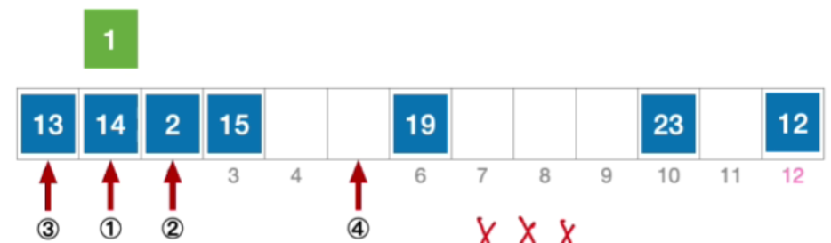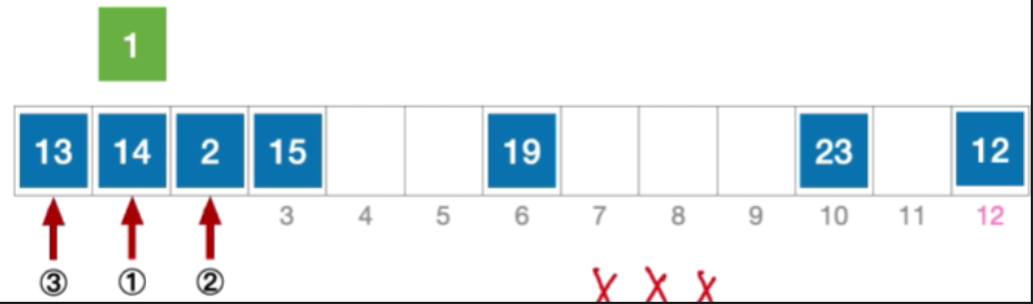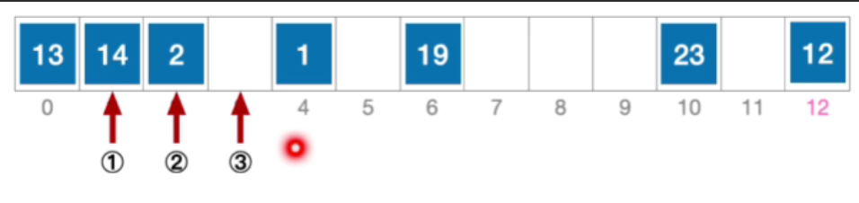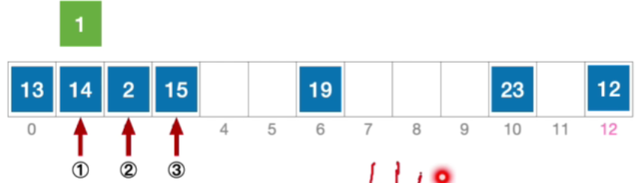 - H 3 = ( 1 + 3 ∗ 12 ) % 13 = 11 , 未发生冲突,插入位置 # 11 H_{3}=(1+3*12)\% 13=11,未发生冲突,插入位置\#11 H3=(1+3∗12)%13=11,未发生冲突,插入位置#11