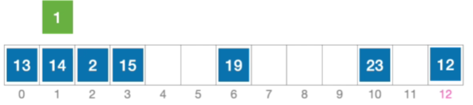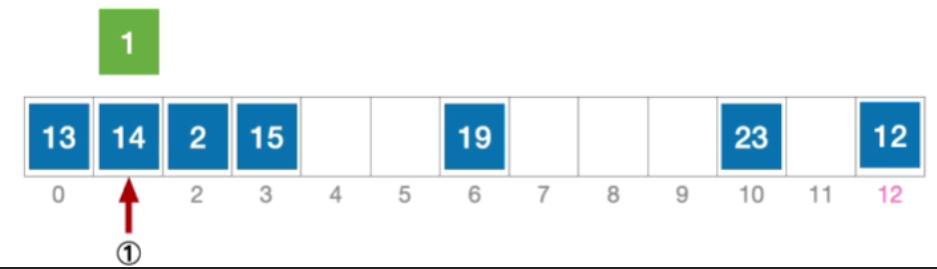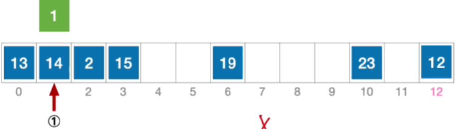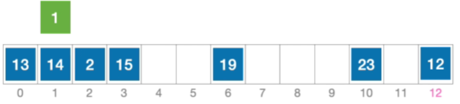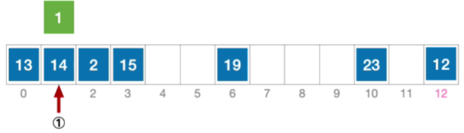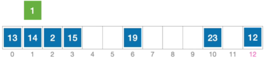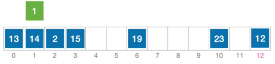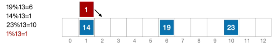 - 计算元素1的初始散列地址=1%13=1。对比位置#1,关键字不等于1;