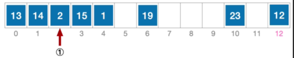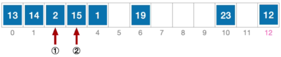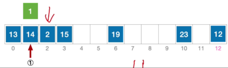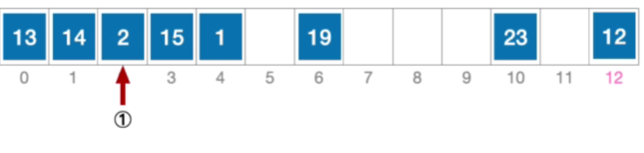 - 计算元素15 的初始散列地址=15%13=2。对比位置#2,关键字不等于15;