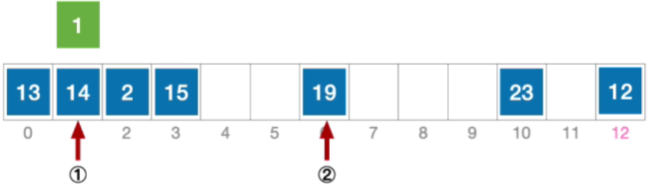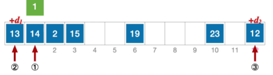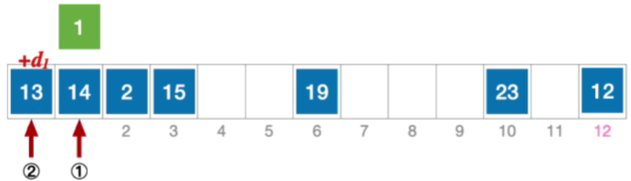 - 例:长度为13的散列表状态如下图所示,散列函数H(Key)=key%13,采用伪随机序列法解决冲突,假设伪随机序列 d i = 0 , 5 , 3 , 11 , ... d_{i}=0,5,3,11,\dotsc di=0,5,3,11,...,其中d_{i}表示第i次发生冲突时的增量。分析:插入元素1、查找元素1的过程