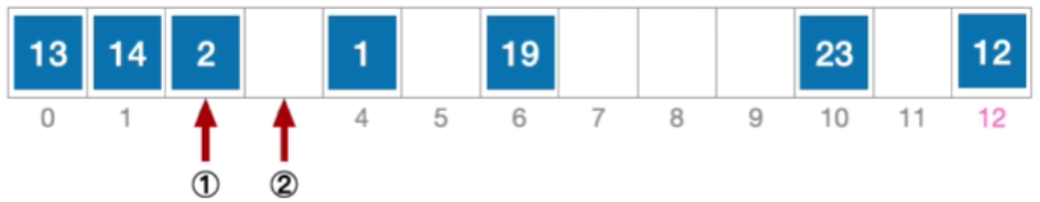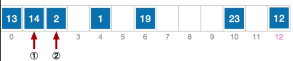 - 所以计算后一个应该探测的位置, H 2 = ( 1 + 2 ∗ 12 ) % 13 = 12 ,发生冲突 ( 第 3 次 ) H_{2}=(1+2*12)\% 13=12,发生冲突(第3次) H2=(1+2∗12)%13=12,发生冲突(第3次)
