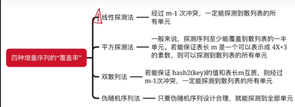 - 双散列法的探测覆盖率取决于第二个散列函数hash(key)设计的是否合理。