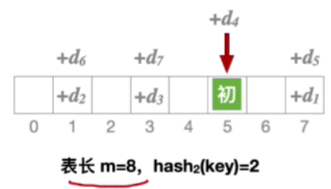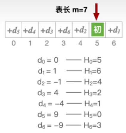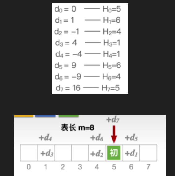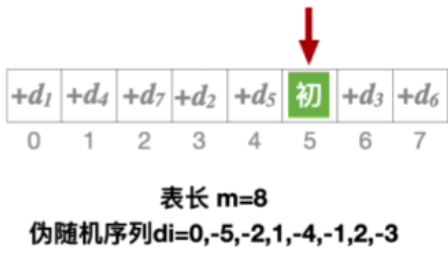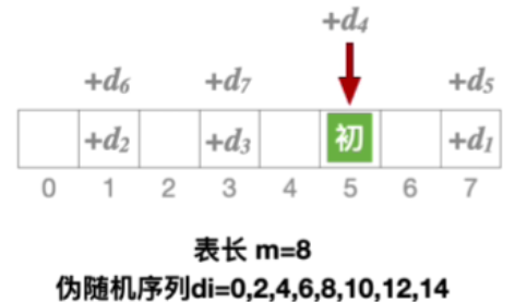 其中 H ( k e y ) H(key) H(key)表示初始散列地址, d i d_i di表示探测序列的第i个偏移量,m表示散列表的表长