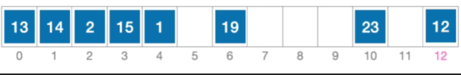 - 例:长度为13的散列表状态如下图所示,散列函数 H(key)=key% 13,采用线性探测法解决冲突。