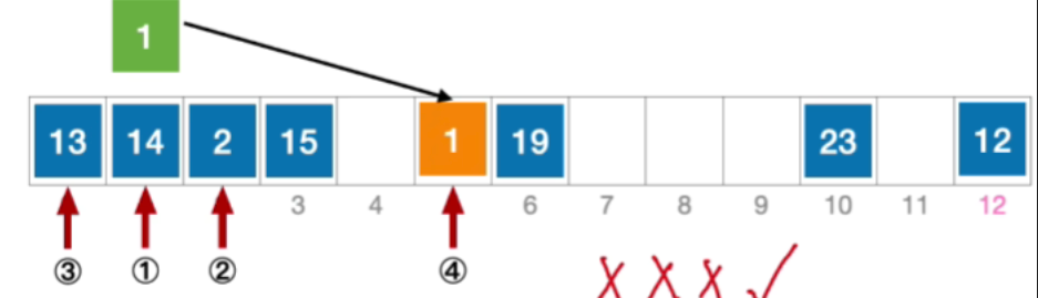 - 由于采用了线性探测法,所以初始的这个位置发生冲突之后应该探测初始位置往右偏移一个单位