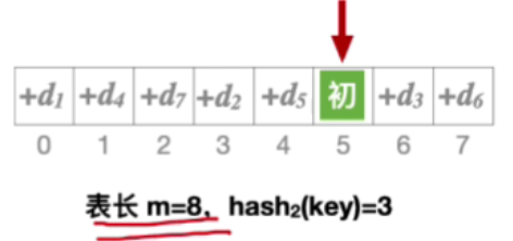 - 假设初始地址为5且表长等于8且发生冲突