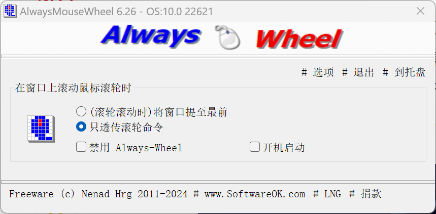 AlwaysMouseWheel是一款非常小巧的鼠标滚轮工具,绿色版,大小只有180K,真的是超迷你。