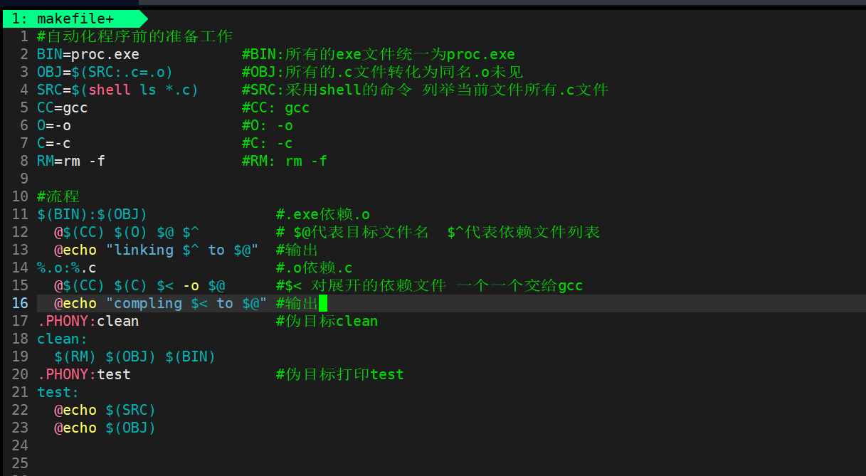 16 @echo "compling $< to $@" #输出