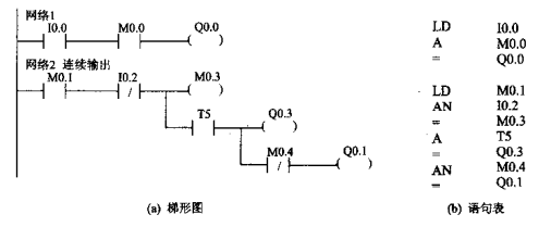 - 连续输出规则 :图片强调了"连续输出电路"的正确用法。图5-2的电路是合法的连续输出,因为逻辑是顺序执行的。而下图展示了一个反例 ,它的逻辑路径出现了分支,不属于简单的串联关系,因此不能直接用 A/AN后接 =的简单序列来编程,需要用到 OLD(Or Load,或块)等指令来处理分支逻辑。